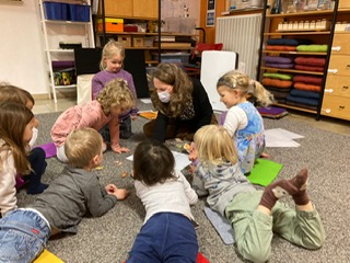 This group experienced the stories “The Three Little Pigs” and “Goldilocks and the Three Bears” as puppet shows. Using them as a springboard, we were able to act out opposites (hot/cold, big/small, fast/slow). We played “Pig, Pig, Wolf”, enjoyed some letter visitors (the B, the S, and the Princess P came), and had fun winning jewels during our lesson on “The Princess and the Pea”.
